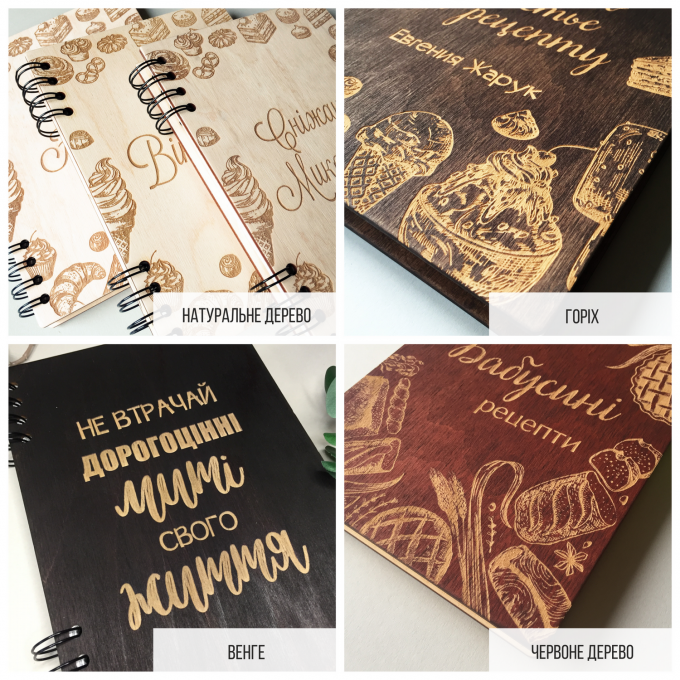 Матеріал обкладинки - шліфована березова фанера товщиною 4 мм. Можна обрати натуральне або тоноване дерево.
